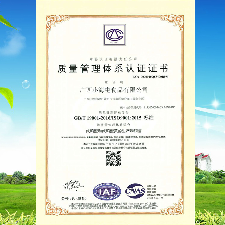 • 熱烈祝賀:廣西小海屯食品有限公司與2020年9月16日 通過ISO9001質量管理體系認證.或者改體系認證證書。 2020-09-21